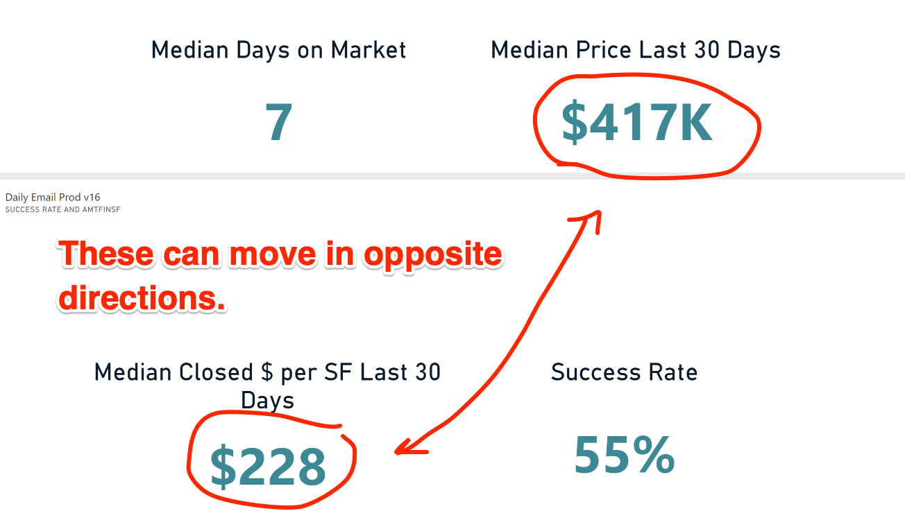 When less expensive housing is in demand, it can impact the Median Price negatively but the Median Price PER FOOT positively.