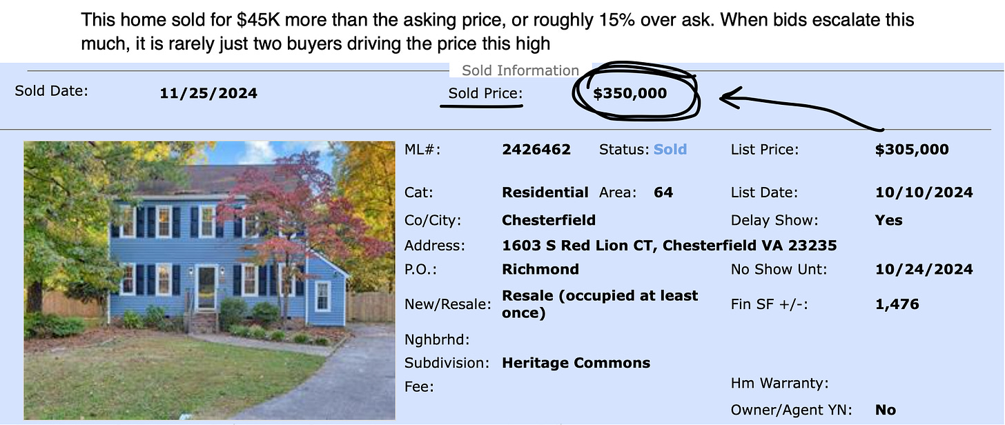 If the home sold for more than asking price, then the price was likely bid up by multiple buyers –– let’s assume that any over asking price sale involved 3 buyers