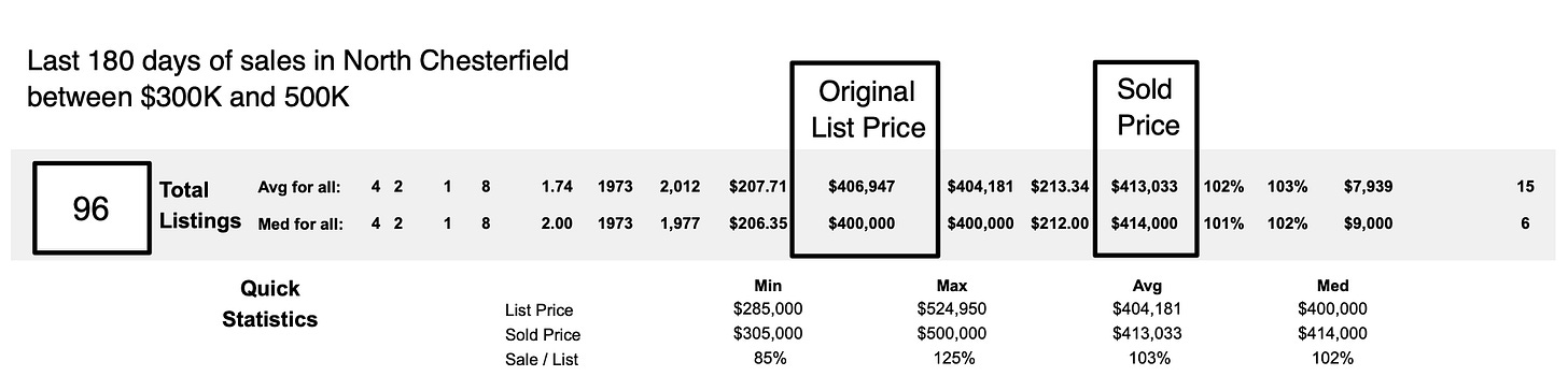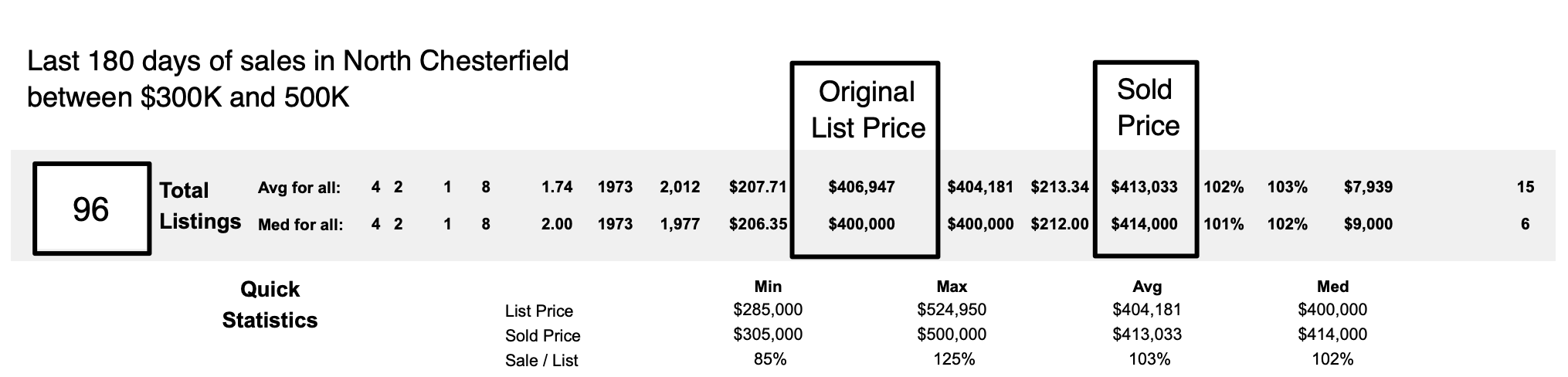 Per the quick CMA feature in our MLS, these homes sold for an average of 102% of asking price tells me that the number of buyers seeking housing in the N. Chesterfield area is greater than the supply.